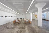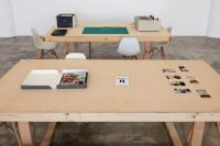 Grupo Ñ presents an ever-changing installation that unravels over four weeks and closely resembles a functional office space. A standard printer and blank sheets of paper are used to create text-based works reflecting the collective’s shifting concerns. These works draw on photographic documentation of past projects, excerpts from contemporary literature, visual references, and transcribed conversations among the members, recorded onsite by poet and writer Lupita Limón. Within this clerical setting, a martini piñata, beer and soda cans, Doritos’ Incognito chip bags purchased from the Tijuana border, and plethora of found objects also circulate. Every word, idea, and exchange accumulates into a public record. The act of witnessing the collective’s process makes visible the negotiations between individual voices and the labor required to shape a shared practice.