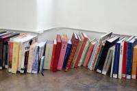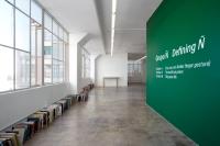 Defining Ñ is the first institutional presentation of the Los Angeles-based collective Grupo Ñ, founded in 2023 by artists Sophia Le Fraga, Michele Lorusso, and Pedro Alejandro Verdin. Having met as students in the Master of Fine Arts program at the California Institute of the Arts, the collective formed around a desire to articulate its identity through a shared language despite cultural complexity. Le Fraga inscribes poetry onto clothing labels and book cards, Lorusso deconstructs words through sculptural forms, and Verdin draws from song lyrics in his paintings. The character “Ñ” from the Spanish alphabet, often mispronounced by non-Spanish speakers, symbolizes the challenges and misunderstandings inherent in defining the self.